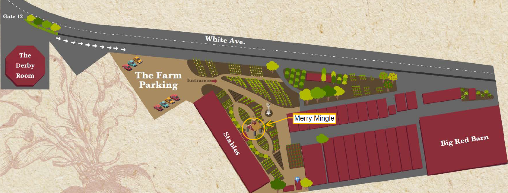 Access to The Farm’s Parking is through Gate 12, drive past The Derby Room parallel to White Ave. Continue to drive past The Deby Room's parking lot and the next parking lot after it. You will then arrive at a dirt lot, this is the parking for The Farm.